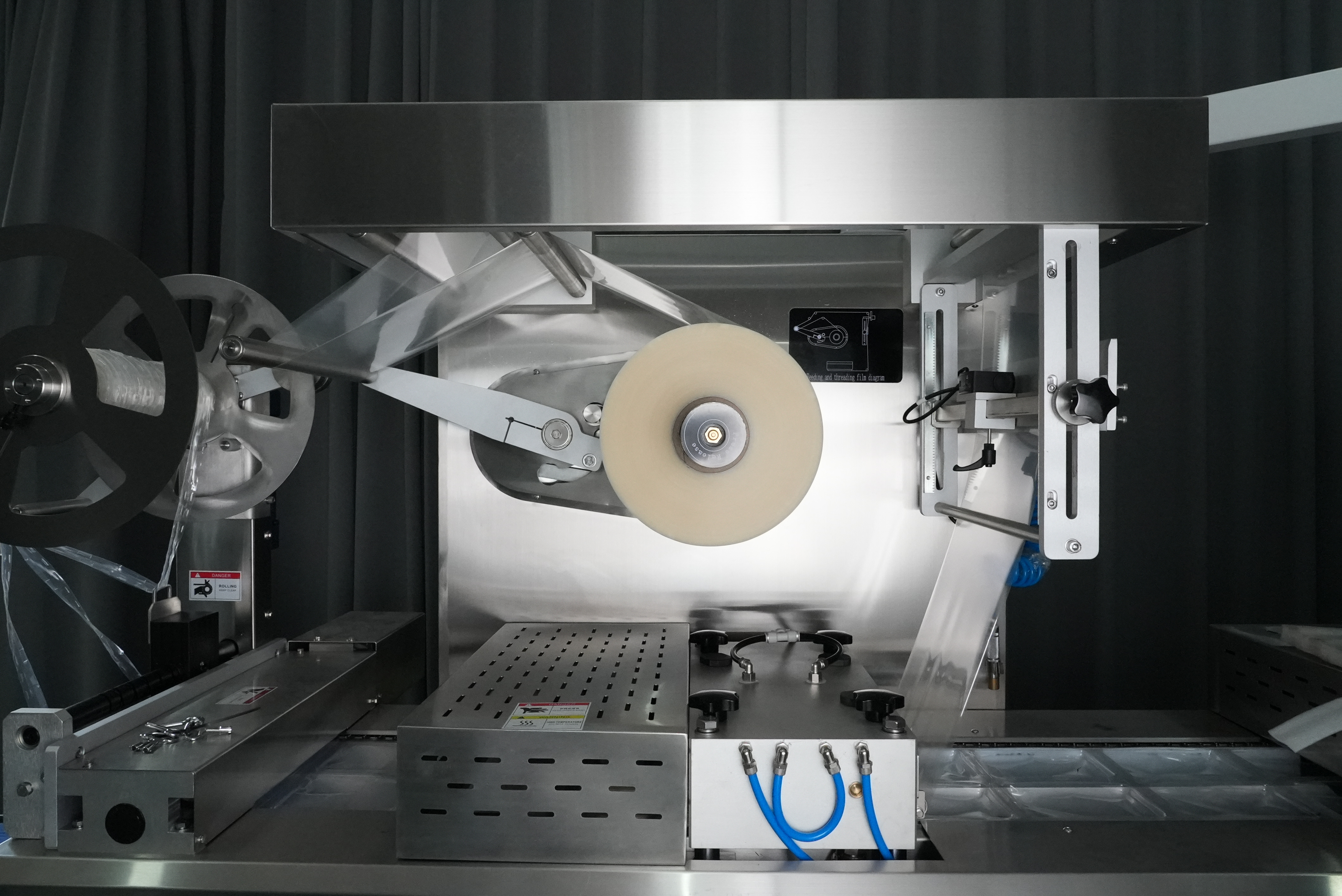 Máy đóng gói Thermoforming tự động tùy chỉnh-In nhãn tùy chọn, kiểu niêm phong cắt chéo (răng răng/phẳng/dễ dàng) và thiết bị cho ăn tự động.